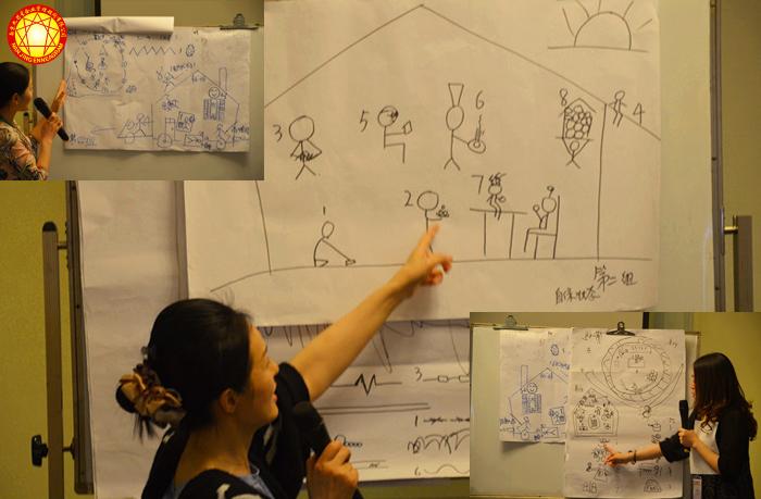 各个小组正在绘画27种副型,非常有创意,你能看懂么?分组画出自保1-9、社交1-9、一对一1-9号的人与家庭、亲密关系及团队的象征状态,通过集体创意作画的方式,学员们更深刻理解27种副型,“这个活动太好了,一下子就全记住了很复杂的27种副型”!