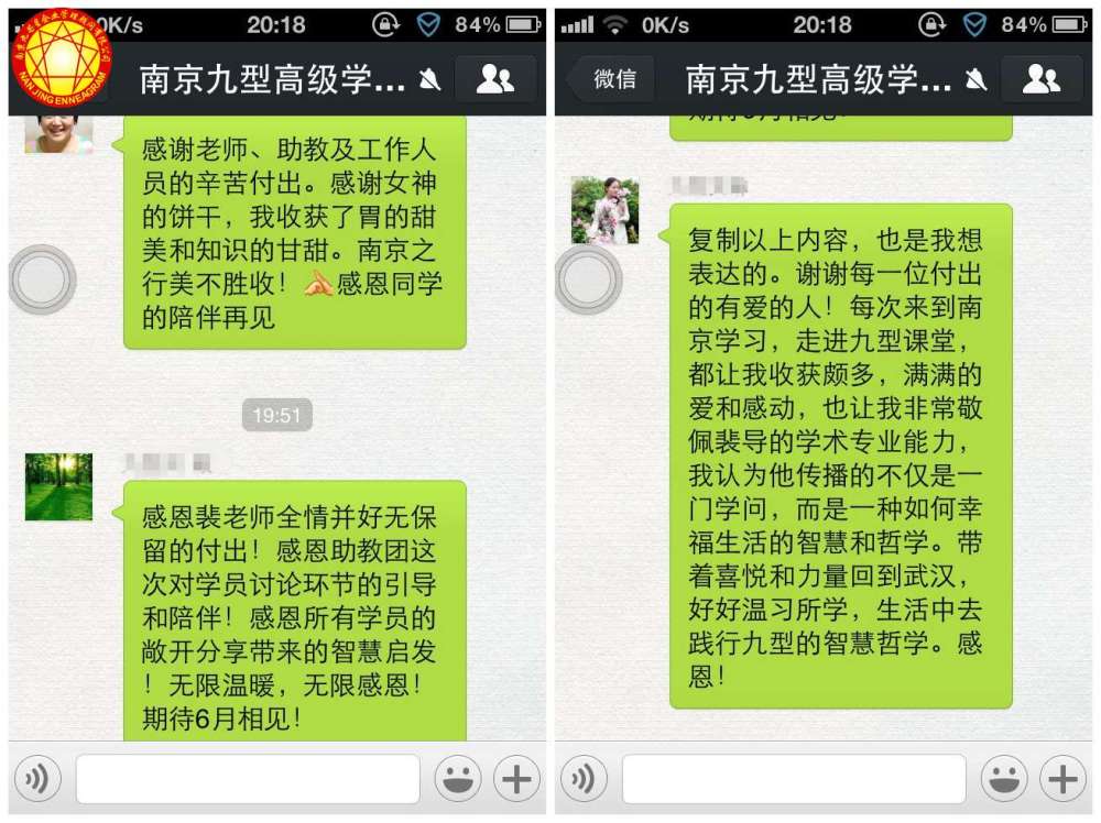 “我来这里(南京九型课堂)特别喜悦,跟裴导师学习不如说是跟大家学习,相对来说,裴老师是一个领路人,而大家的分享除这个课堂以外,其他书上、网络上所没有的;这里就像是我的精神家园,就像游击队找到了组织,孩子找到了亲生爹妈一样;以前学习其他的九型课程,被老师贴上了标签,他说我是8号我就说我是7号,我就跟他唱反调,搞得很不开心;但是这里很不一样,这里很开放,尊重让学员自己去探索去寻找,自己找的过程很宝贵,找到的时候是真的很开心.....”