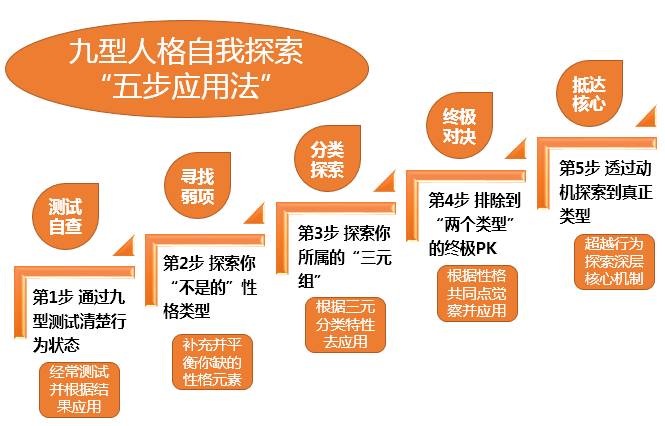 第五步,也是最后一步,此时你已经走过了自我探索的漫长旅程了……在这一步,你需要深度的自我觉察,开始超越行为层面,绝大多数人在这一步都需要有专业导师的带领才能真正完成,甚至有人很多年无法确定自己的主导的真实类型,要完成这一步,你必须经历一场身心的震撼,不仅仅是头脑的反应,你会发现有一根线贯穿了你所有的行为,有一个点牵动了你所有的表面,你也许会特别难为情,身体发抖,全身冒汗甚至有一些更为激烈的身心反应……这个一般在我们的专业课程经常发生。当你穿越了所有表面的行为,最终抵达性格探索的终点的时候,你会一下子豁然开朗,往事历历在目,你一下子立体而完整地看见了你的内在世界!你会理解很多人、很多事……总之,这场英雄般的自我探索之旅此时告一段落了,九型人格开始在你内在发生根本性的作用,与之前四步不同在于,第五步你必须进入到核心模式,此时不仅仅是表面行为,而是催化你的成长、觉醒。
