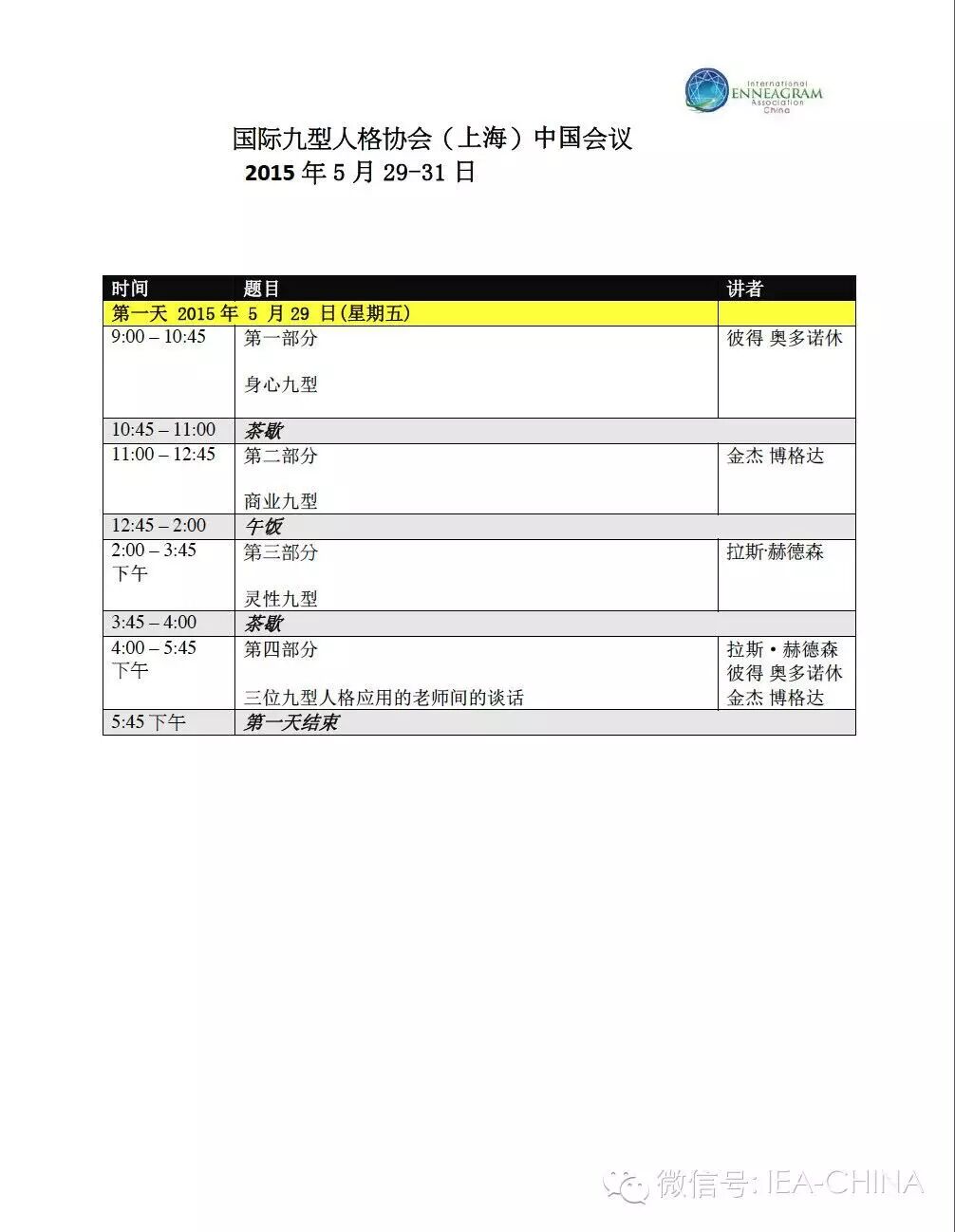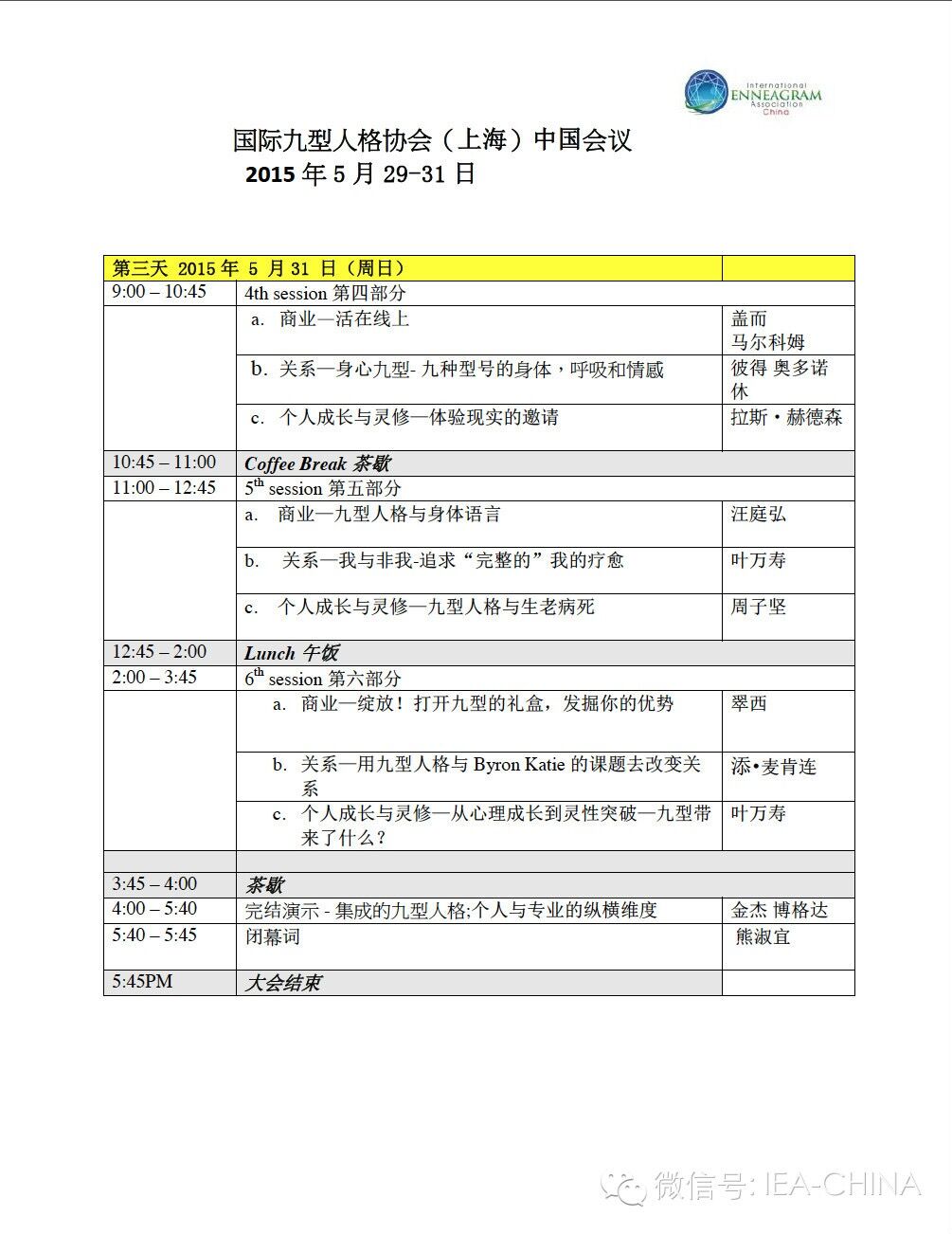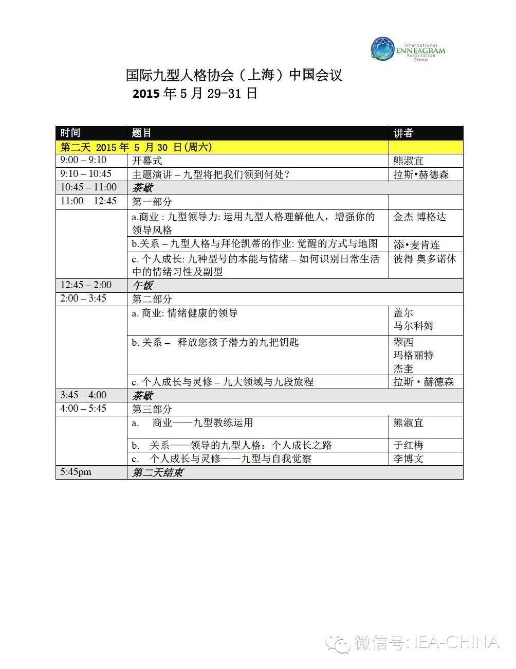 在IEA21周年庆典来临之际,为使更多人认识和接触一个更加开放和公平的九型人格平台,国际九型人格协会(IEA)将在2015年5月29日-31日于中国上海举办第四届中国国际大会,由国际九型人格协会(中国)分会主办。这也是第一次在中国大陆地区举办的IEA世界九型人格大会。本次大会汇集全球十余位九型人格权威专家,包括:Russ Hudson、Ginger Lapid-Bogda 、Peter’O.......等人。这次大会的形式有别一般讲座,不以讲者为中心,而是以参与者为主要资源。让参会者自然地投入、开放地交流,从而启发团体智慧及创造力!南京九芒星企业管理顾问有限公司是本次大会的主办方之一。
