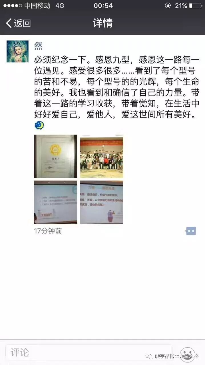 这次三阶段是体验环节最多、讲解最充分最透彻的一次三阶段——最透彻深入的中心运作模式解析、最精彩绝伦的型号情景剧、首次“同型共修”催眠唤醒实战体验、玄武湖户外性格应用分组体验……尽管五天三晚已是历届最长时间,但时间仍很不够,但是我只能接受这个“缺憾”,几天下来,我们360度深度觉察模式,即便是老九型也有非常多的收获,课程能量场越来越高,在最后一天达到顶点!我的身体也是越来越轻松,结束时只有感动和喜悦,浑身放松而充满能量,也许这就是能量交换吧!
