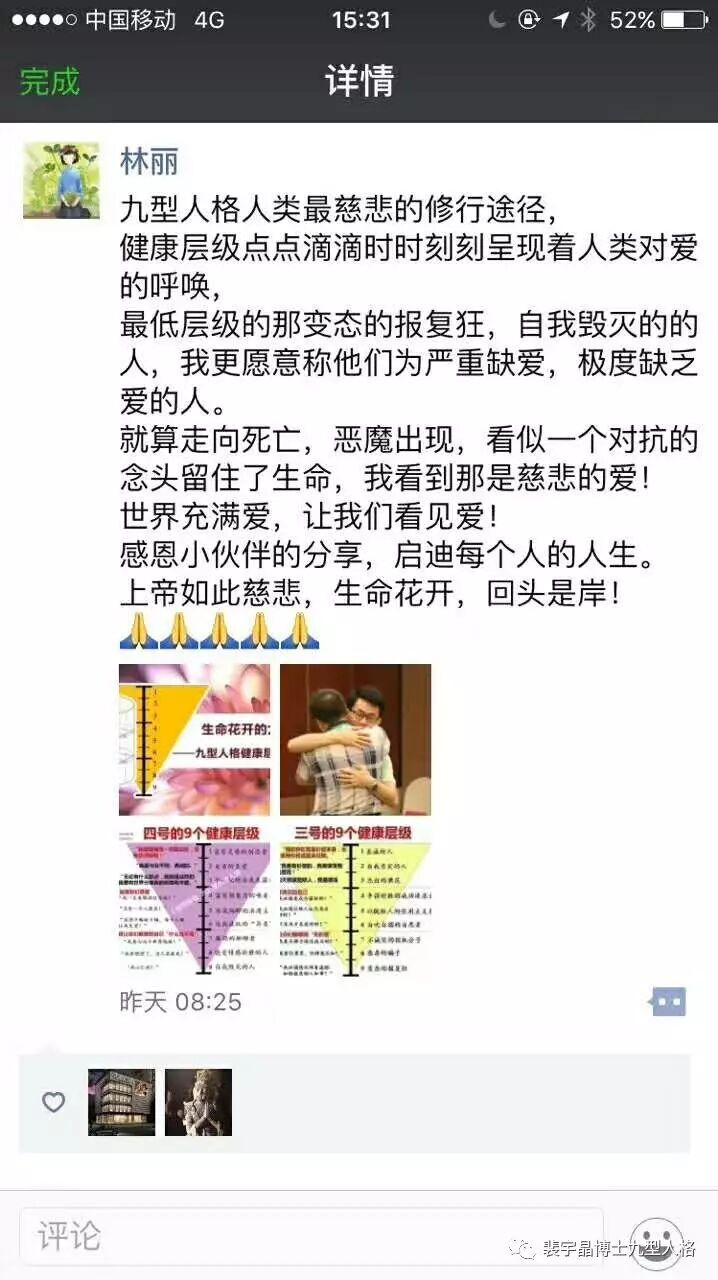 一个曾经从可怕的重度抑郁的自我毁灭的、变态的、想杀人分尸的魔鬼状态的人(4w3的第九层级)到一个热爱和拥抱生命的、慈悲的、富有创造力的灵感泉涌的,充满爱和良善的天使状态的人(4号的第一层级)九型人格可以救人,可以让每一个生命都在这个场得到疗愈!