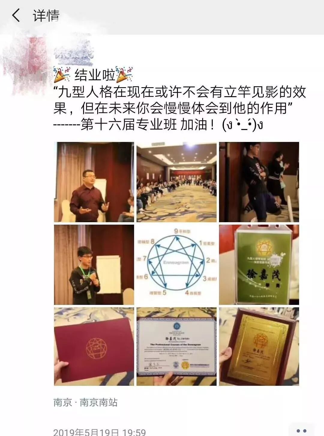 “学习九型四年多时间,第一次如此深入体验到九型的魅力!跨时3个月,长达14天奔走南京学习,回首一切付出都太值得!感恩遇到裴导,感恩遇到大家,一同成长一同绽放!我爱你们。”