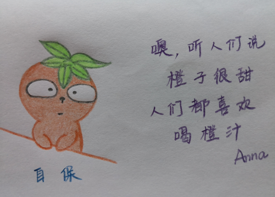 自保柿心里想:噢,听人们说,橙子很甜,人们都喜欢喝橙汁……